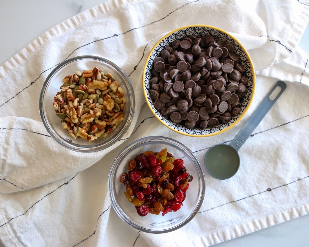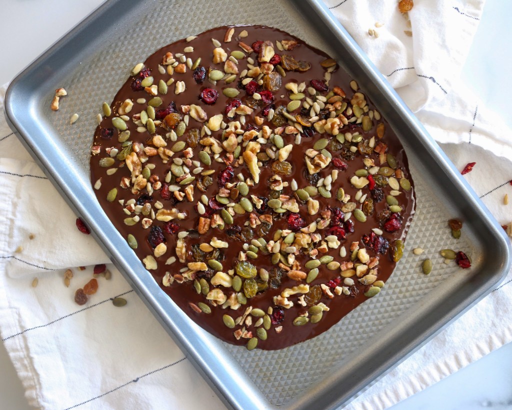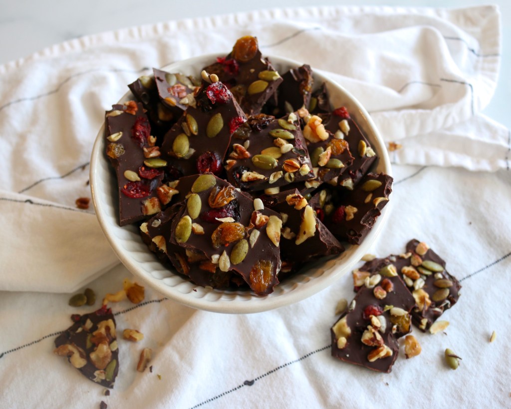 This may be the easiest recipe I’ve ever posted on here and really doesn’t even need a recipe to follow, but I still wanted to share it because of how great of a treat it is! This fall bark uses dark chocolate, nuts, seeds and dried fruit to create a healthier treat that is easy to store and grab a bite of when you’re in the mood for a little something sweet. For this recipe, you can easily get creative and make a bark that fits with your preferences and what you might already have in your pantry. The possibilities are endless, but I’m sharing what I used to make mine below.