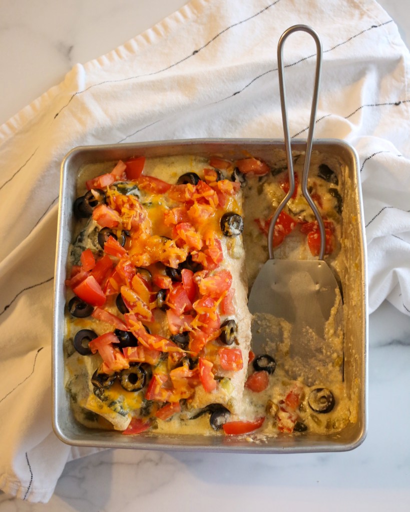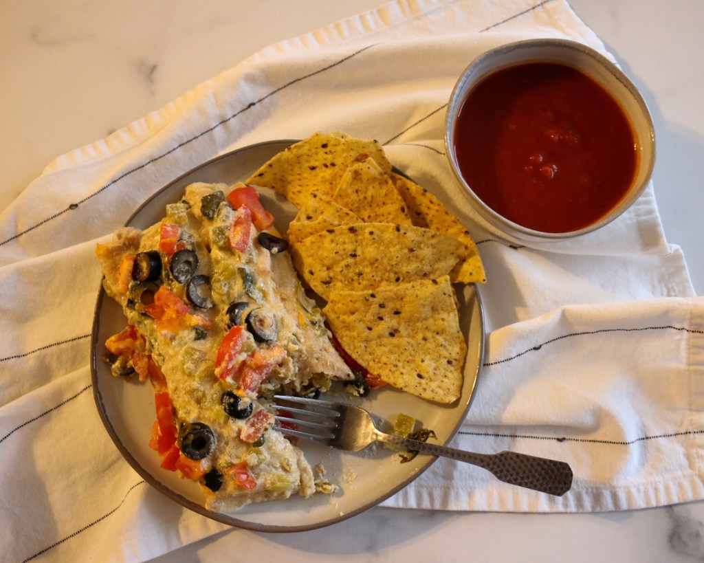 • This recipe is also packed with spinach, tomatoes, olives, green onion, and green chiles that all provide lots of their own nutrients (and flavor) to this meal.