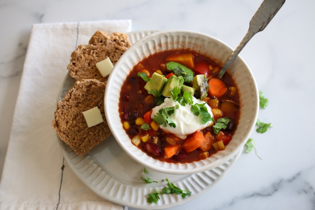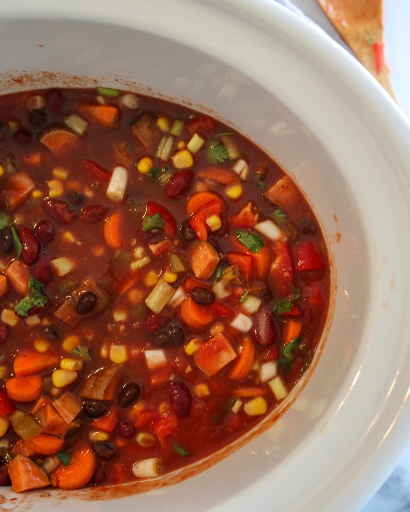 This chili recipe is perfect for fall and packed with tons of vegetables that taste and smell amazing. Plus it’s a crock pot/ slow cooker recipe so all you really need to do it dump the ingredients in, give it a stir and walk away! There’s nothing better than coming back into the kitchen and being welcomed by the warm aromas of a delicious meal that is waiting for you.