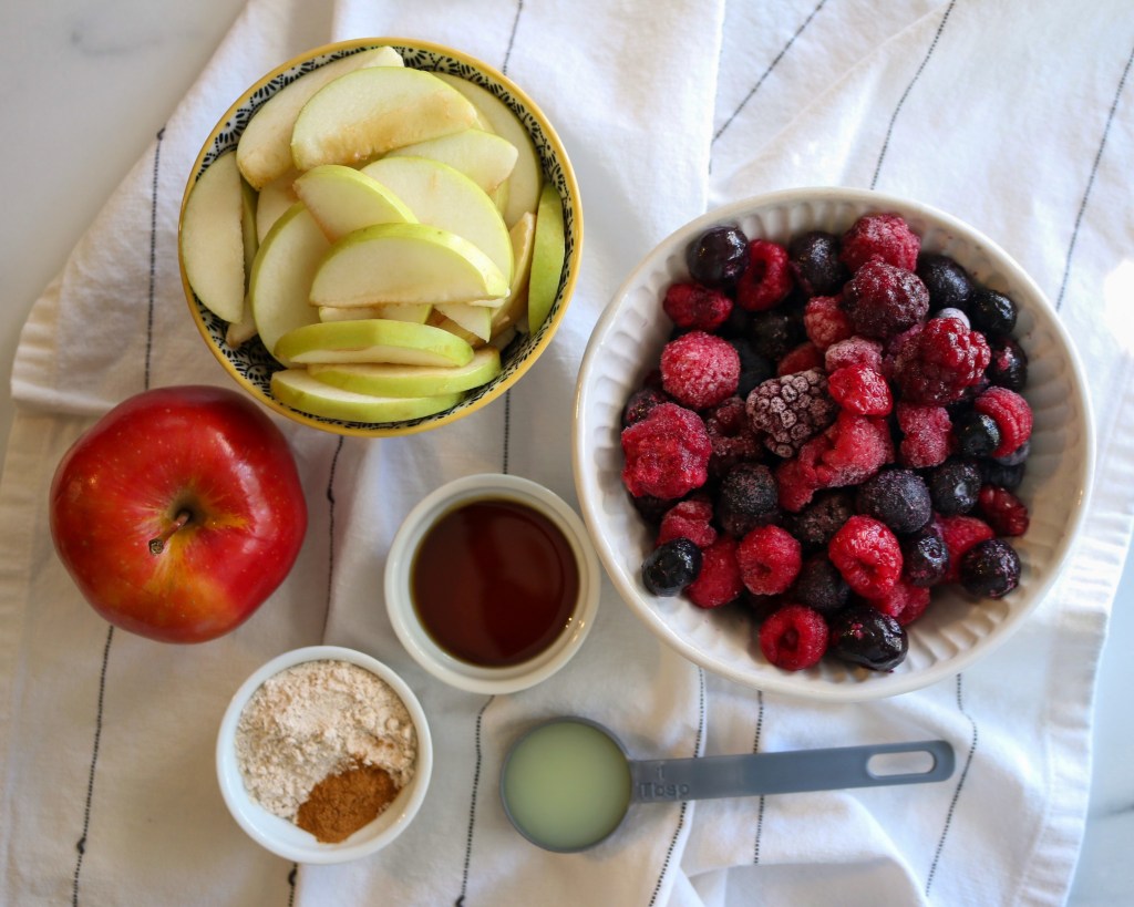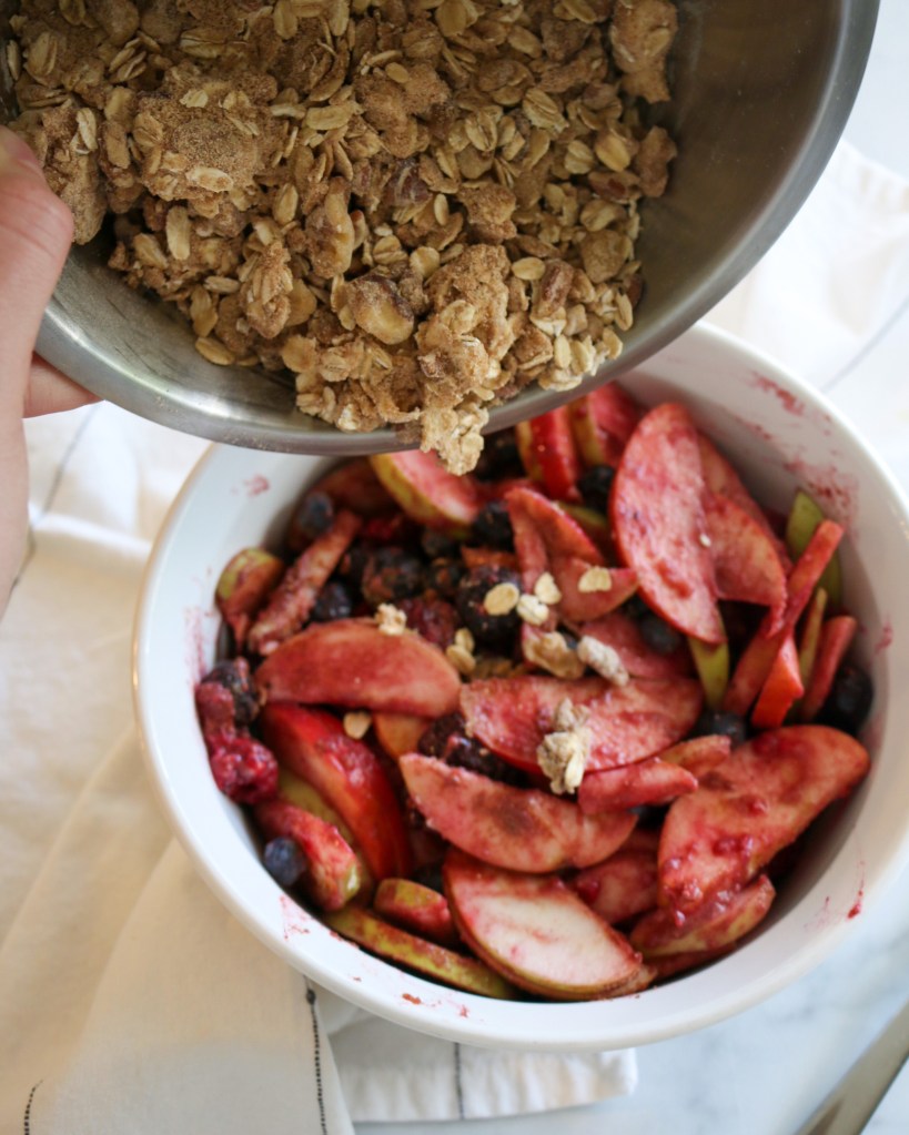 2. Lightly toss apples and berries with lemon juice and maple syrup. Add in flour and cinnamon and toss together again. Pour into an 8 x 8 or similar sized pan or dish.