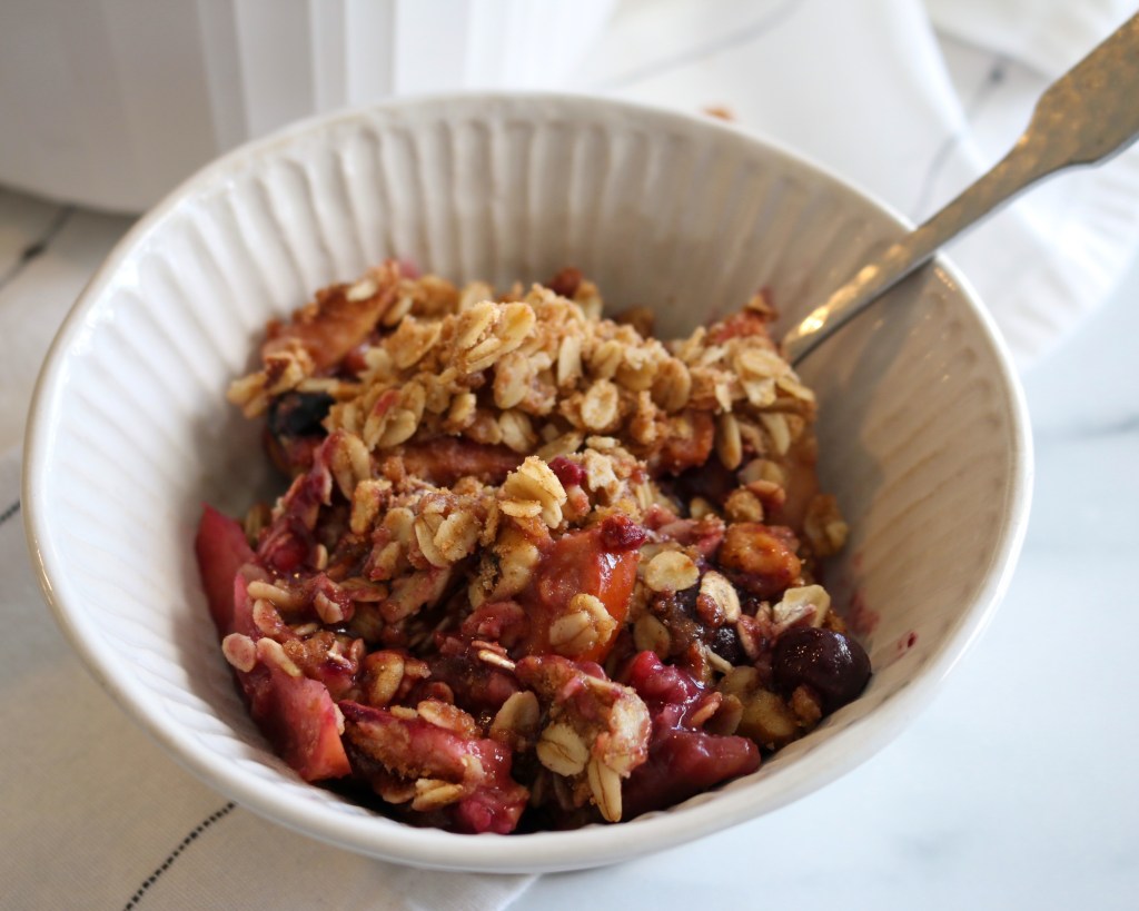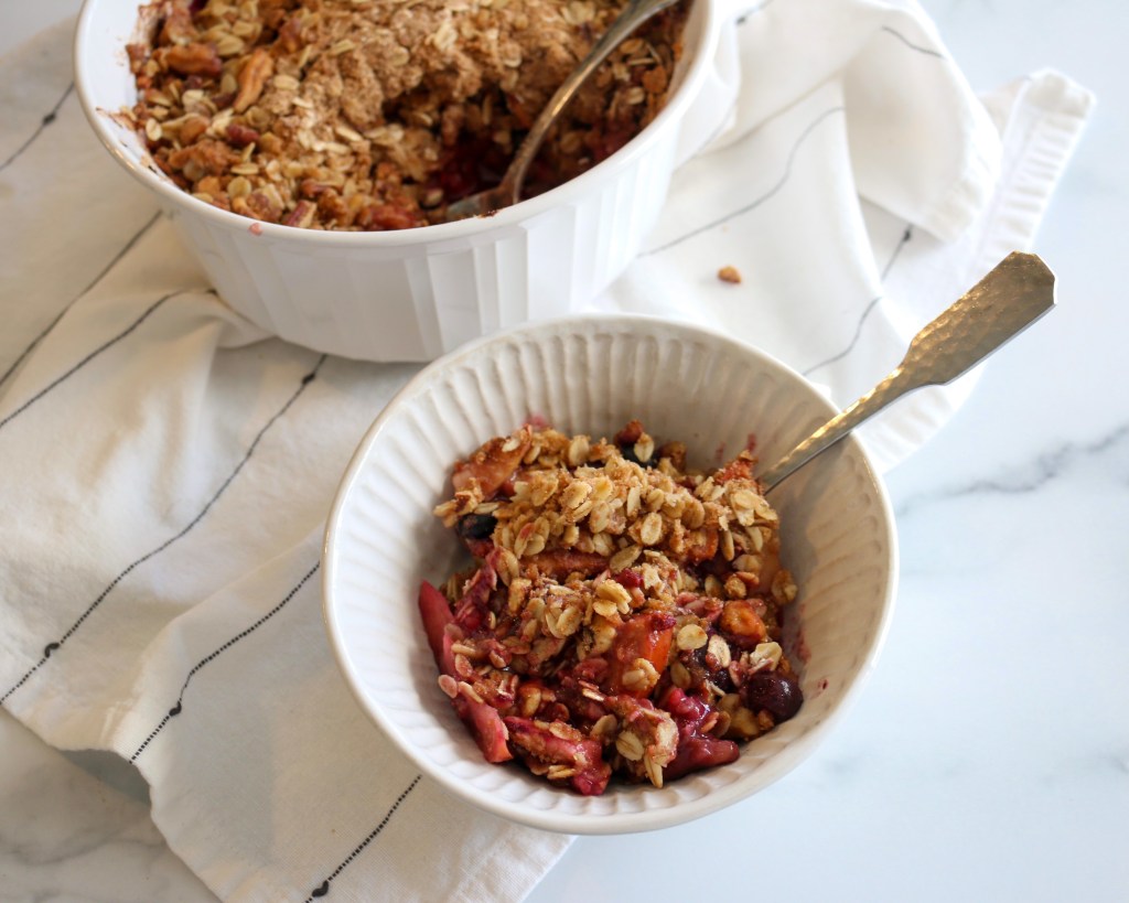 This recipe is full of delicious fruit and topped with crispy, crumbly topping that is made healthier by using less sugar, swapping a few simple ingredients and adding nuts for healthy fats and nutrients!