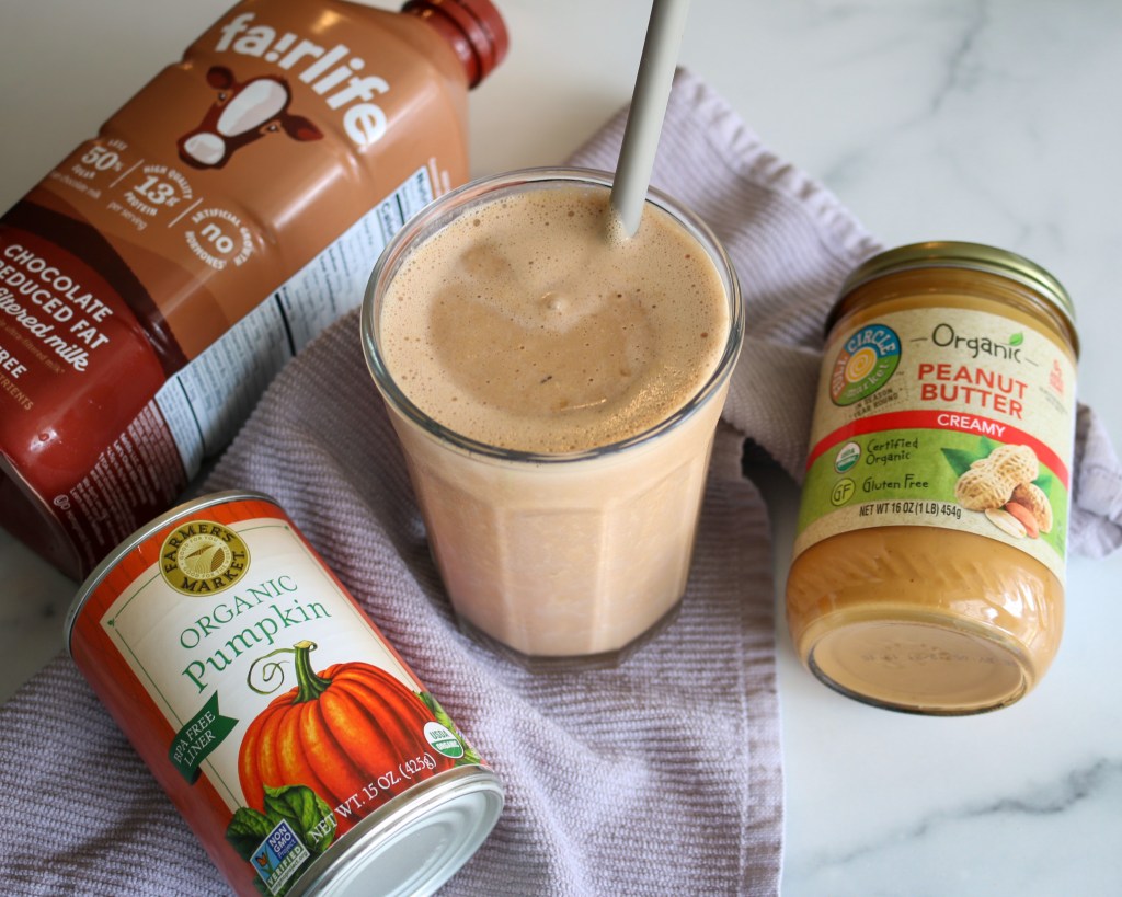 This is a “recipe” that I started making the other week as only a chocolate peanut butter shake, but then when I thought about posting it on here, I got the idea to add a little bit of pumpkin in for some added nutrients and fall flare! The pumpkin is subtle (you can always add more if you want more flavor), but I think it goes great with peanut butter and chocolate.