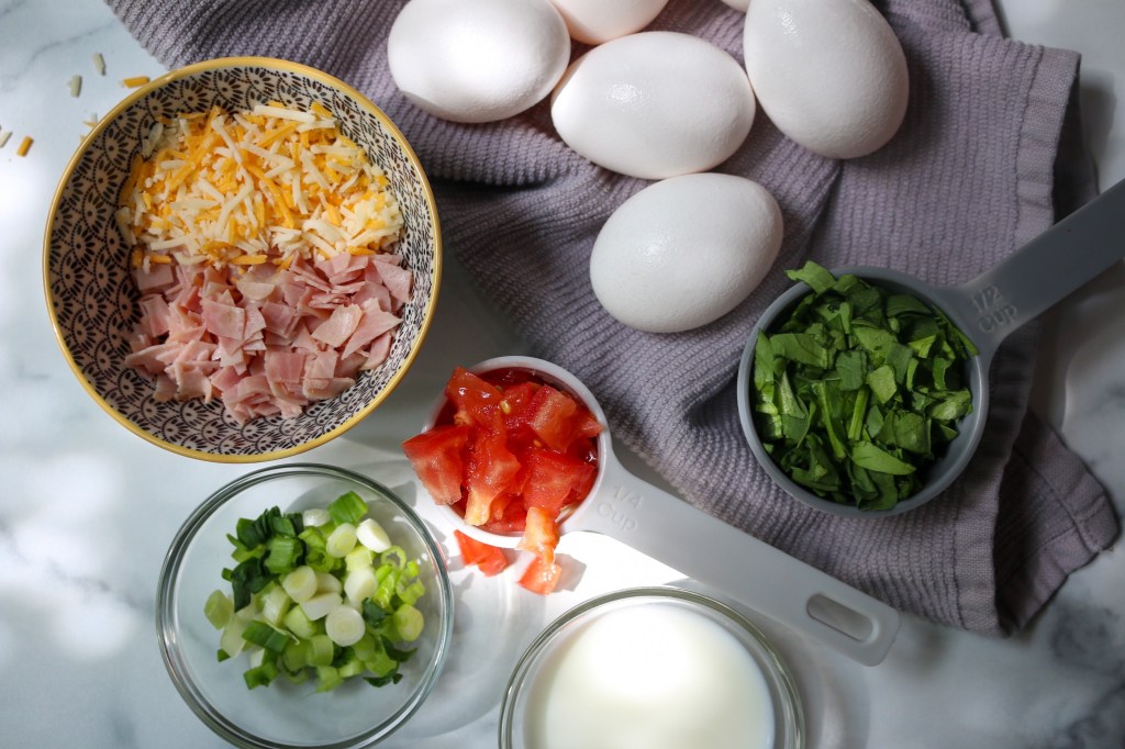 - Whisk eggs in a medium bowl, then add all other ingredients and mix until evenly distributed.